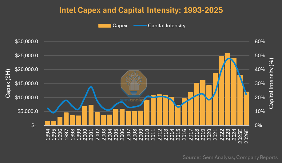 For you history buffs - Between 1994 and 2019, only twice Intel spent less capex than TSMC. But from 2020, TSMC consistently outspent Intel. In 2025 alone, TSMC will spend $22B more capex than Intel. However, 47% of Intel's 2025 capex is offset by subsidies, partners (Apollo, Brookfield) and customer payments.