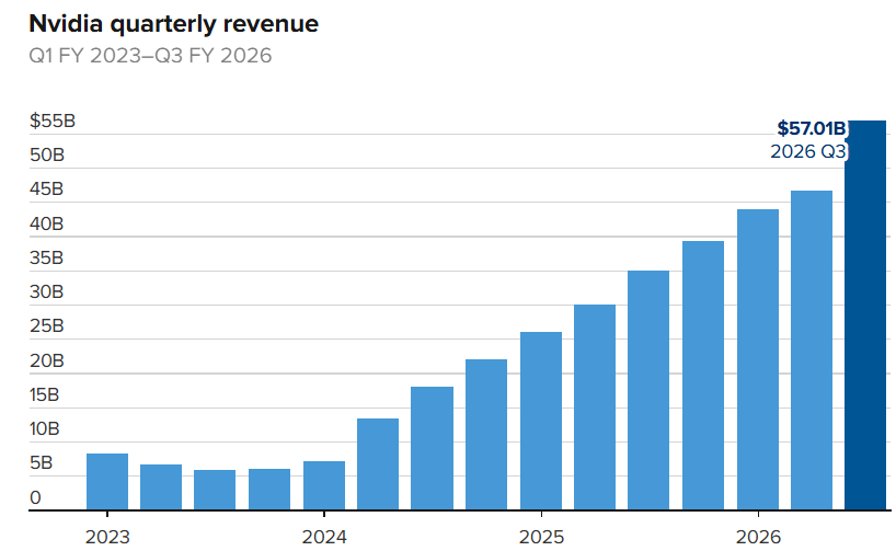 Nvidia recorded revenue of $57.0 billion, up 22% from Q2 and 62% from a year ago.